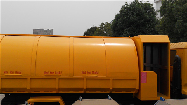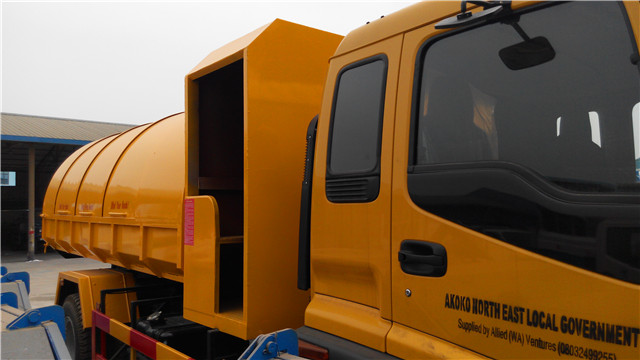 該車是尼日利亞用戶在實地考察了我廠后定購的,該車根據(jù)用戶的實際使用環(huán)境經(jīng)過了特殊設(shè)計:密封垃圾箱設(shè)計成了橢圓形,便于雨水流走,另外,根據(jù)實際使用需要,在垃圾斗的前面還設(shè)計有一個乘人間,便于垃圾清運(yùn)人員的乘坐。
