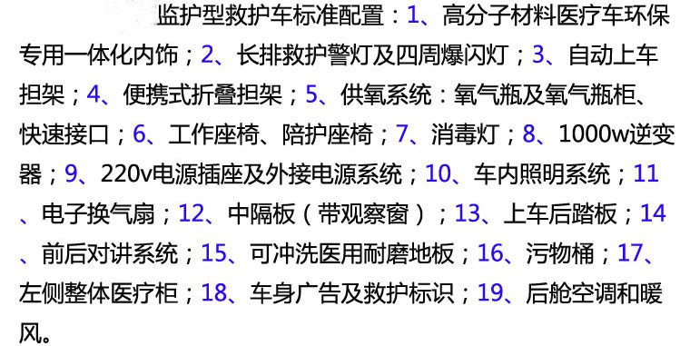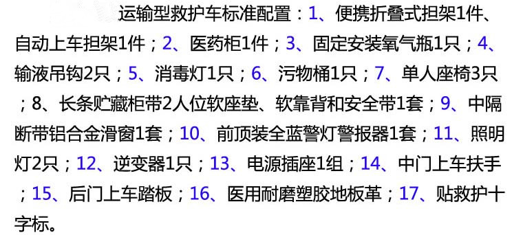其它 1.車內(nèi)裝置藥柜、擔(dān)架、氧氣瓶、輸液掛鉤等專用裝置;2.隨底盤選裝中頂時整車高度為2490mm;隨底盤選裝高頂時整車高度為2875mm;3.ABS系統(tǒng)控制器型號:APG3550500G;ABS系統(tǒng)控制器生產(chǎn)企業(yè):浙江亞太機(jī)電股份有限公司;發(fā)動機(jī)最大凈功率83KW;4.隨底盤選裝后踏步板,對應(yīng)整車長度為5696mm,不選裝后踏步板時對應(yīng)整車長度為5496mm;隨底盤選裝輪罩蓋,選裝前霧燈,選裝黑色前大燈;6.車身可選裝爆閃燈.車頂可選裝圓柱形爆閃燈.