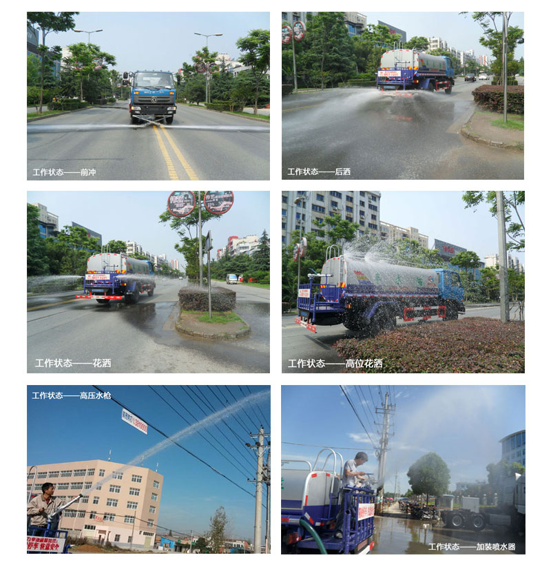 1. 噴藥灑水車:加裝噴藥裝置,噴藥射程15-80米可選,裝水容積4-20方可選。 2.吸糞灑水車:集吸糞和灑水于一體,配汽油本田灑水泵+大功率真空吸污泵。 3.載貨灑水車:水罐裝在載貨車箱內(nèi),配灑水泵,也可裝水龍頭用于工地和礦區(qū)儲水。 4.保溫灑水車:罐體外面加8厘米厚保溫層,適合北方使用,也可運送熱水。 5.雪鏟灑水車:車前配可拆卸式雪鏟,冬天用于鏟雪開路,方便可靠。 6.帶吊灑水車:裝有隨車吊,可配2-10噸吊機,用于綠化種植吊樹澆灌。 7.消防灑水車:配消防泵消防炮,射程達45米,配消防帶接口,作消防用。 8.越野灑水車:采用4驅(qū)6驅(qū)底盤,越野輪胎,適合礦區(qū)煤井等場合作業(yè)。