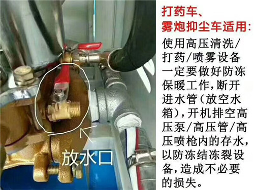 冷空氣來(lái)了,北方地區(qū)氣溫突降,會(huì)出現(xiàn)嚴(yán)重冰凍,使用抑塵車的客戶朋友們一定要做好防凍保暖工作,斷開(kāi)進(jìn)水管(放空水箱),開(kāi)機(jī)排空高壓泵/高壓管/高壓噴槍內(nèi)的存水,以防凍結(jié)凍裂設(shè)備,造成不必要的損失。冷空氣來(lái)襲!提醒各位水車用戶,晚上整車灑水開(kāi)關(guān)、水泵開(kāi)關(guān)、球閥開(kāi)關(guān)打半開(kāi)狀態(tài)放水,第二天用車時(shí)需加引水,檢查水箱防凍液是否充足!