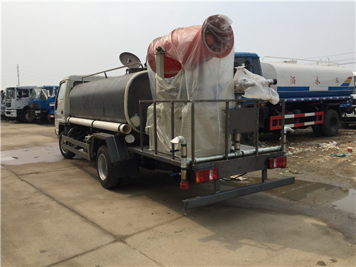 專用部分:具有前沖后灑、側(cè)噴(更換噴頭后變?yōu)閭?cè)花灑)、后置式工作平臺(帶踏梯,四周有安全護欄)、平臺上設(shè)置有高壓水炮(可360°旋轉(zhuǎn),可調(diào)成柱狀最大射程28米,也可調(diào)成霧狀最大射程14米,可調(diào)成:直沖狀、大雨、中雨、小雨、毛毛雨),整車灑水寬度大于14米.配備優(yōu)質(zhì)大功率專用灑水泵,取力器,雜物過濾網(wǎng),國標(biāo)通用65型消防接口(可通過消防栓加水)、1套自流球閥系統(tǒng)(可自吸自排,最大吸程6米),2根引水鋼絲膠管(帶陰陽快速接頭),配鎖,水位計,作業(yè)高音喇叭.兩側(cè)及后加強型保險杠,防滑爬梯,膠管儲存筒。