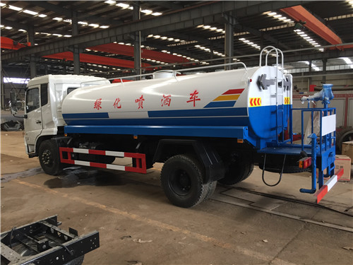 東風天錦12噸灑水車采用東風天錦中日合資DFL1160BX豪華底盤,排半帶臥可前翻駕駛室,康明斯180馬力國五發(fā)動機,東風6檔變速箱,軸距4500mm,4.5噸前橋,9噸后橋,9.00R20原廠鋼絲胎,原廠abs,原廠空調(diào),帶方向助力,離合助力器,氣剎制動。