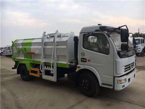 另外側(cè)裝垃圾車與壓縮式垃圾車的結(jié)構(gòu)體為:推板壓縮,掛桶側(cè)裝,垃圾站對(duì)接,垃圾自卸裝置。通過(guò)拉桿提升垃圾桶自動(dòng)倒入垃圾,并往車廂后方推動(dòng)擠壓垃圾,達(dá)到壓縮垃圾的目的,壓縮原理是采用機(jī)、電、液壓聯(lián)動(dòng)控制系統(tǒng)、電腦控制及手動(dòng)操作系統(tǒng),通過(guò)填裝器和推鏟等裝置實(shí)現(xiàn)垃圾倒入,壓碎或壓扁,并將垃圾擠入車廂并壓實(shí)和推卸;從而實(shí)現(xiàn)對(duì)接壓縮垃圾車塊轉(zhuǎn)運(yùn)運(yùn)輸功能等。