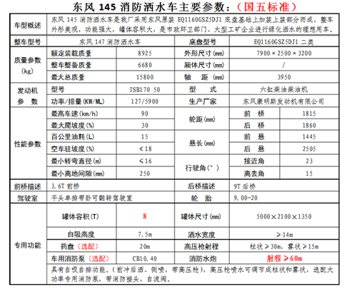 東風(fēng)145消防灑水車整車型號:CLW5165GPST5;發(fā)動機:玉柴/康明斯;免征公告:有;罐體容積:12立方;環(huán)保公告:有;底盤型號:EQ1160GD5DJ;灑水寬度:20米;垂直吸程:8米;水炮揚程:35米;軸距:3950mm;上戶噸位:9噸;排放標(biāo)準(zhǔn):國五;外形尺寸:7790X2500X3200;輪胎型號:9.00-20;側(cè)噴面積:>80平方米;后灑面積:>15平方米;水泵轉(zhuǎn)速:1180r/min。