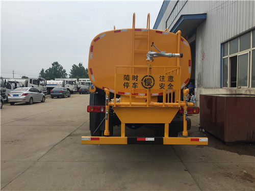 上裝配置:罐體有效容積12立方,采用5毫米厚武鋼碳板板自動焊接制作,配品牌大功率灑水泵,帶前噴后灑側(cè)噴,尾部平臺帶高位水炮,可自吸自排。前沖14米寬,水炮射程28米,自吸深度7米。