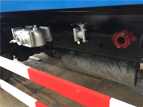 灑水車在應急消防時,其操作程序是:調節(jié)三通球閥 G 到如圖位置(注意:三通球閥凹坑所對方向關閉),關閉不銹鋼球閥 A、B、C、D、E 和鋁合金球閥 H,打開消防栓 I 和不銹鋼球閥 F,踏下離合,打開取力器開關,慢慢松開離合(千萬不可過快,否則將會損壞取力器或變速箱),使水泵開始工作,即可通過灑水炮和消防栓出口應急消防,停止工作后開關回位。