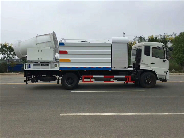 東風(fēng)12噸抑塵車選配50米噴霧機(jī)達(dá)到除塵效果。霧炮機(jī)是根據(jù)風(fēng)送原理,先使用進(jìn)口高壓泵、微細(xì)霧化噴嘴將水霧化,再利用風(fēng)機(jī)風(fēng)量和風(fēng)壓將霧化后的水霧送到較遠(yuǎn)距離,使得水霧到達(dá)較遠(yuǎn)距離同時能夠覆蓋更大面積,水霧與粉塵凝結(jié)后降落,從而達(dá)到降塵目的。