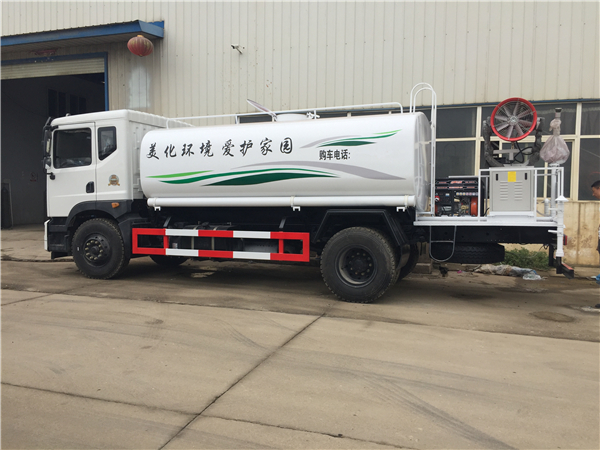 灑水車標準配置和選裝配置,有前沖、后灑、綠化澆灌、遠程水炮等裝置。采用輕質的鋁合金材料,并設置有多重安全防護裝置與報警系統(tǒng)。灑水車罐體采用4毫米Q235碳鋼一次鑄造成型,罐體容積12立方。