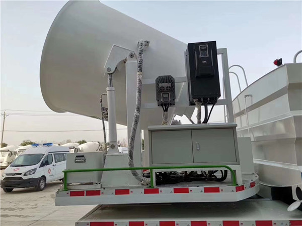 抑塵車后部加裝操作平臺,平臺上安裝高壓水炮,高壓炮豎管采用U型螺栓固定,防止噴水時產(chǎn)生沖力,罐體后部加裝上下扶梯,罐體頂部圍板形式。保證人員在罐頂作業(yè)時的安全。