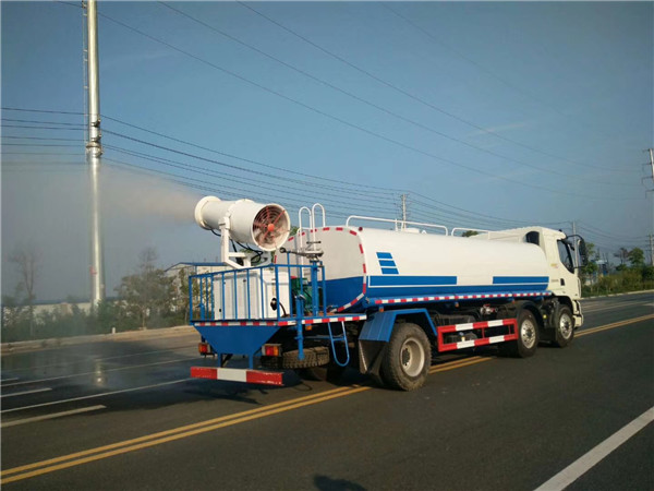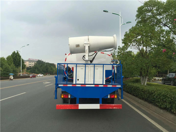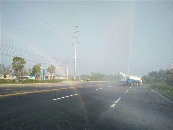 灑水車后工作平臺安裝有湖北程力公司自行設(shè)計的扇形噴嘴,主要對路面進行保潔和壓塵,灑水寬度可達14m以上(角度可自行調(diào)整)。該裝置的優(yōu)點為灑水呈霧狀或半霧狀,具有較好的壓塵和增濕效果。