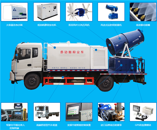 多功能抑塵車整車型號:DLQ5250TDYL5,底盤型號:EQ1250GLJ,新款御龍或T5駕駛室、康機(jī)210馬力、八檔變速箱、280×80×(7+4)mm大梁、5噸前橋、10噸雙后橋、軸距4350+1300mm、輪胎11.00鋼絲輪胎(不帶噴霧機(jī),選裝噴霧機(jī)如下)
