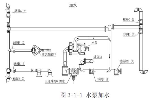 當在野外自采水的情況下,水能通過水泵給罐內供水,其操作程序是:在三通球閥G處接一膠管,調節(jié)三通球閥G到如圖位置(注意:三通球閥凹坑所對方向關閉),關閉不銹鋼球閥A、B、C、D、E、F和消防栓I,打開鋁合金球閥H,踏下離合,打開取力器開關,慢慢松開離合(千萬不可過快,否則將會損壞取力器或變速箱),使水泵開始工作,即可向罐內加水,停止工作后開關回位。